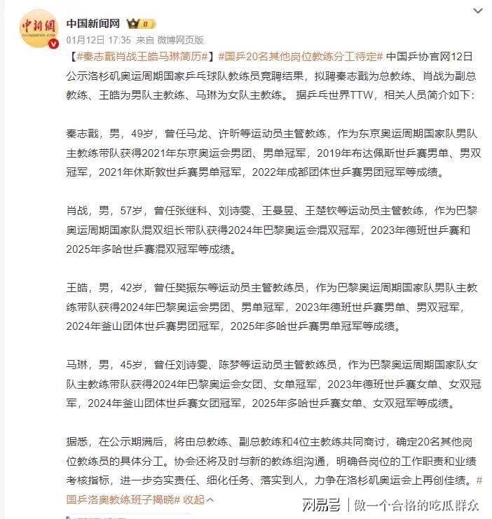 千呼万唤始出来!2026年1月12日,中国乒协正式公示洛杉矶奥运周期教练员竞聘结果,一场牵动无数球迷心弦的"高层大洗牌"尘埃落定。"
